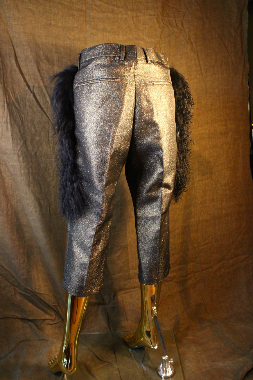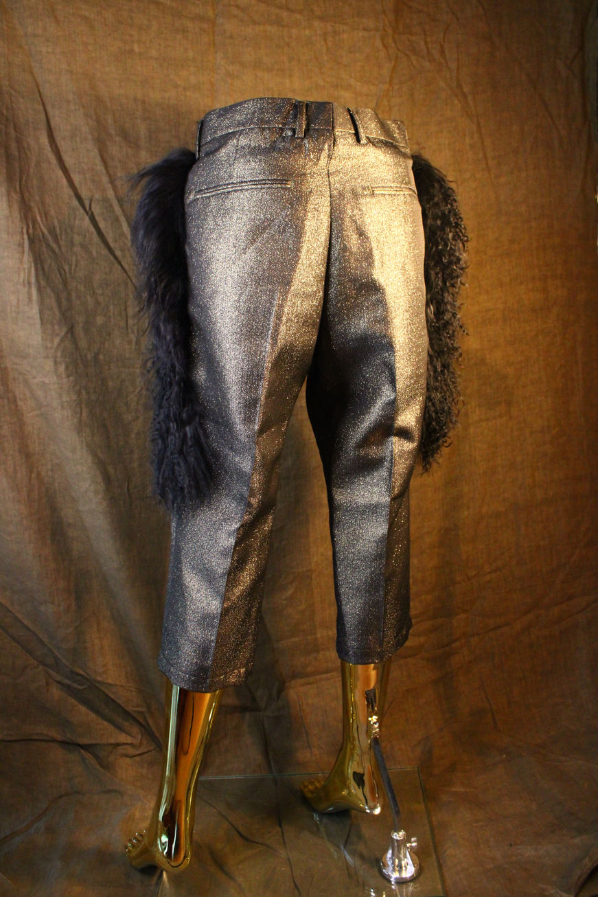 Elevate your style with the Midnight Ebony Trousers, a bold fusion of sophistication and avant-garde design. Crafted from shimmering metallic fabric, these cropped trousers exude luxury and elegance, while the plush faux fur accents add a touch of dramatic flair. Perfect for those who dare to stand out, this couture piece is designed for statement-making moments. Pair them with sleek heels or edgy boots to complete the look.