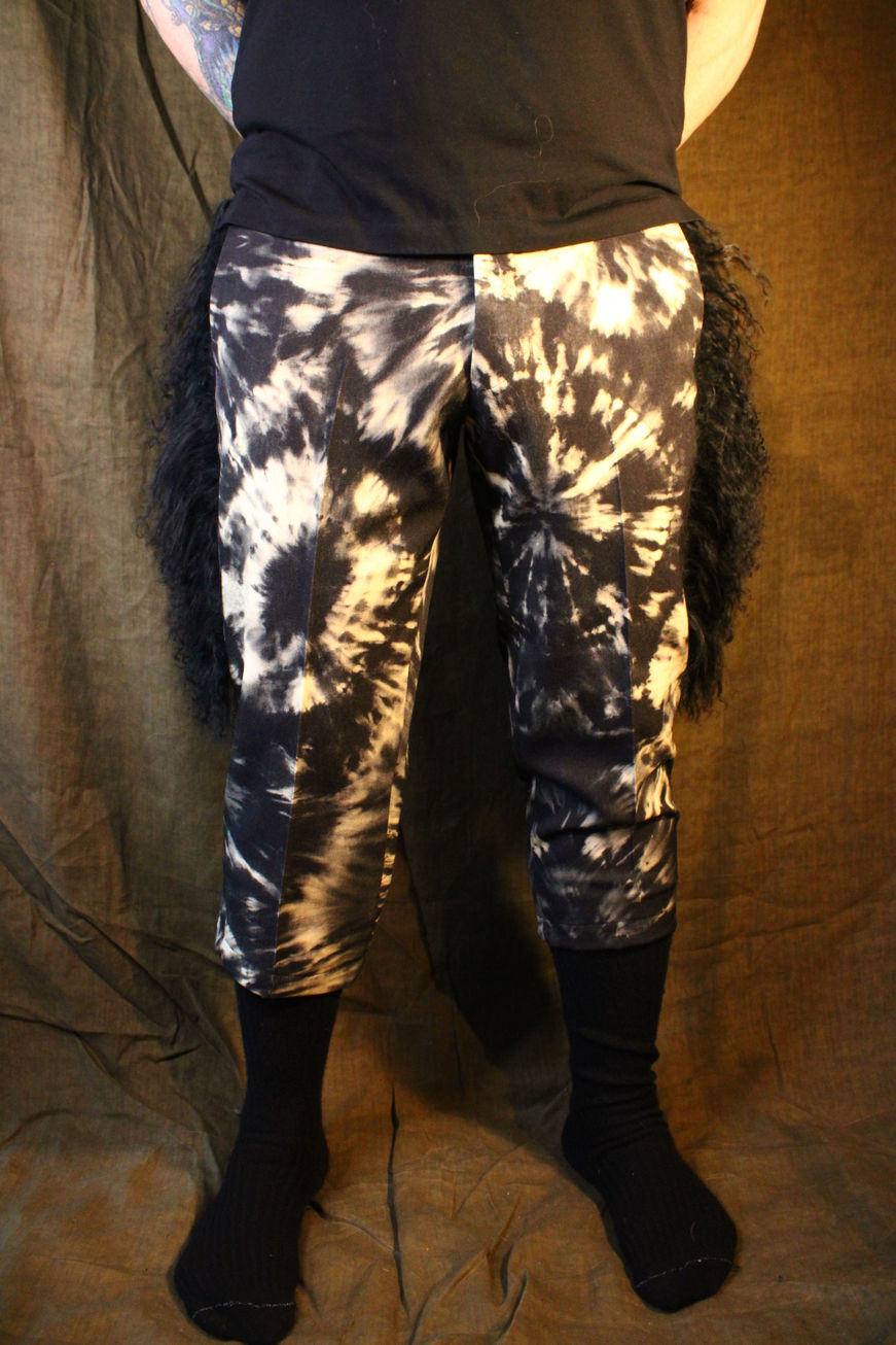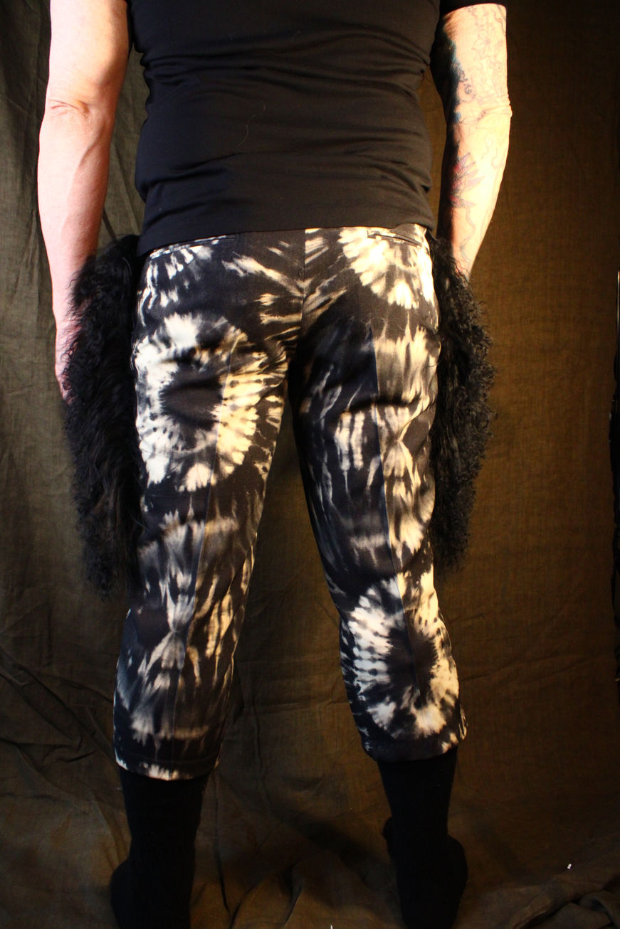 Make a bold statement with the Eclipse Trousers, a daring blend of artistic expression and high-fashion design. Featuring an intricate tie-dye pattern in deep black and cream hues, these cropped trousers exude a rebellious yet sophisticated edge. The plush faux fur side panels add a dramatic contrast, making this piece a true conversation starter.