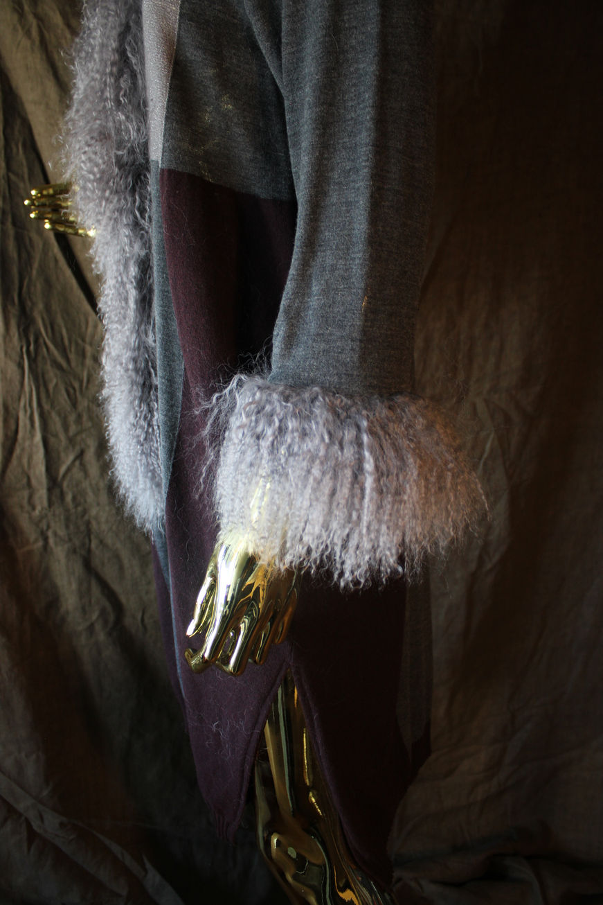 This sophisticated knit dress blends comfort with high-fashion elements, featuring a soft wool blend in a chic color-block design. The luxurious shearling details on the front panel and cuffs add a touch of texture and warmth, creating a statement look. With its relaxed fit and stylish contrast of fabrics, this dress is perfect for both casual and elevated occasions.